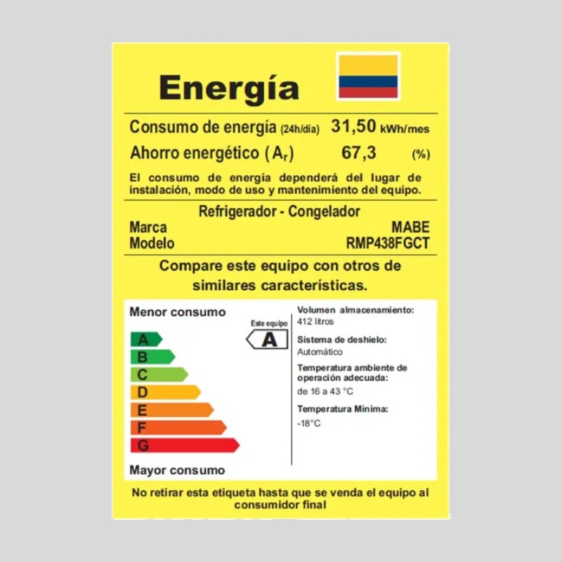 La nevera MABE RMP-438FGCT con tecnología Home Energy Saver ahorra hasta un 56% de energía, gracias al compresor Eco Advance y gas refrigerante R600. Cuidamos su bolsillo con componentes de alta eficiencia que maximizan el ahorro de energía. Le da más frescura con el sistema Total Fresh Flow, que mejora la distribución del aire y así sus alimentos se conservan por mucho más tiempo