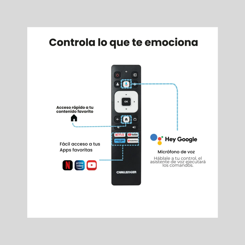 El televisor CHALLENGER smart Google 50KG85 es el compañero perfecto para transformar tu sala en un cine personal. Su pantalla amplia te sumerge en colores brillantes y detalles nítidos, haciendote sentir parte de cada escena.